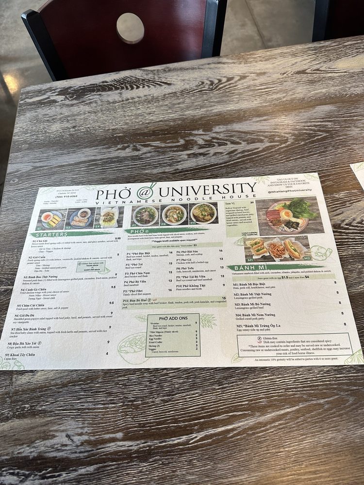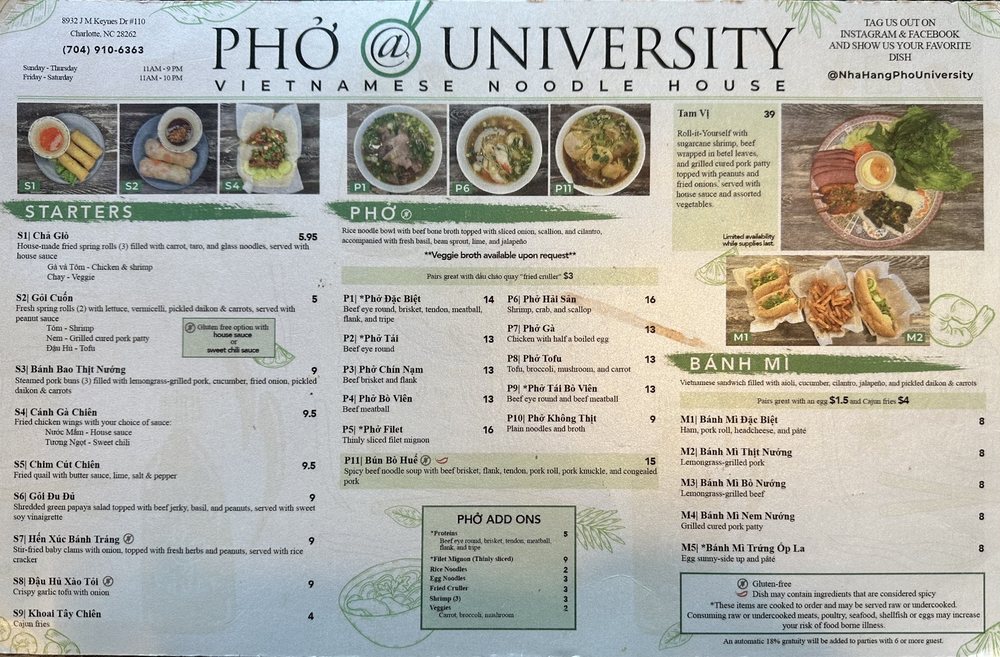 Welcome to Pho@University, your go-to spot for authentic Vietnamese cuisine in Charlotte, NC. Nestled at 8932 J M Keynes Dr, this trendy eatery offers a vibrant atmosphere that’s perfect for groups and casual gatherings. One of the main highlights of the menu is their signature pho, celebrated for its rich, deep broth and tender, paper-thin meat.